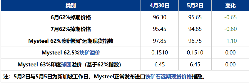 截止到5月4日,今年五一小長假假期內(nèi)進(jìn)口鐵礦石市場整體表現(xiàn)較為冷清,海外掉期處于窄幅震蕩的狀態(tài)。而價格指數(shù)因為隨著從主力月的變換則出現(xiàn)了下跌,其中Mysteel62%澳洲粉礦遠(yuǎn)期現(xiàn)貨指數(shù)在5月2日為96.75美元/干噸,相較于4月30日97.85美元/干噸下跌1.10美元/干噸,跌幅約為1.12%。