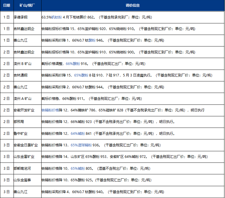 五一假期期間,鋼企國內(nèi)鐵精粉按需少量采購,受外盤市場下行影響,壓價心態(tài)明顯,整體市場偏弱運行。假期期間部分鋼企、礦山調(diào)價信息如下: