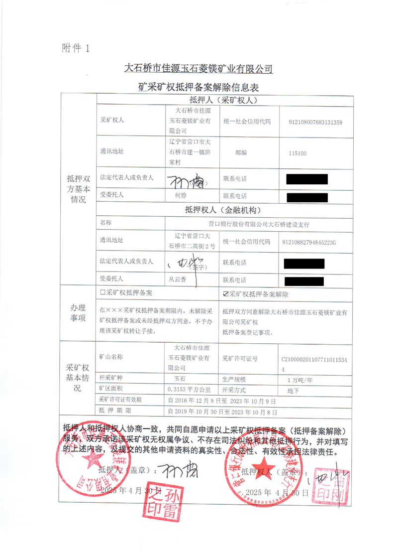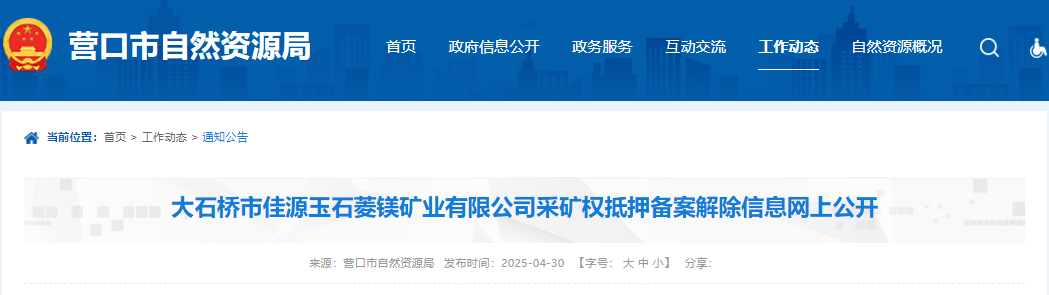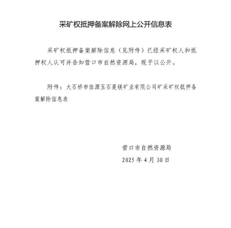大石橋市佳源玉石菱鎂礦業(yè)有限公司采礦權抵押備案解除信息網上公開