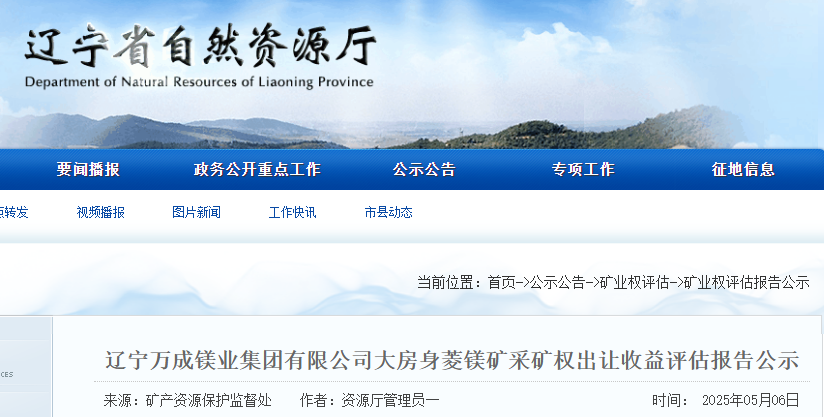 遼寧萬成鎂業(yè)集團(tuán)有限公司大房身菱鎂礦采礦權(quán)出讓收益評(píng)估報(bào)告通過遼寧省自然資源廳門戶網(wǎng)站向社會(huì)公示,公示10個(gè)工作日。如有異議,請(qǐng)于公示之日起10個(gè)工作日內(nèi)以電話方式先向省自然資源廳礦產(chǎn)資源保護(hù)監(jiān)督處提出簡(jiǎn)要意見,隨后及時(shí)將書面意見反饋到省自然資源廳礦產(chǎn)資源保護(hù)監(jiān)督處。