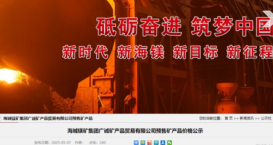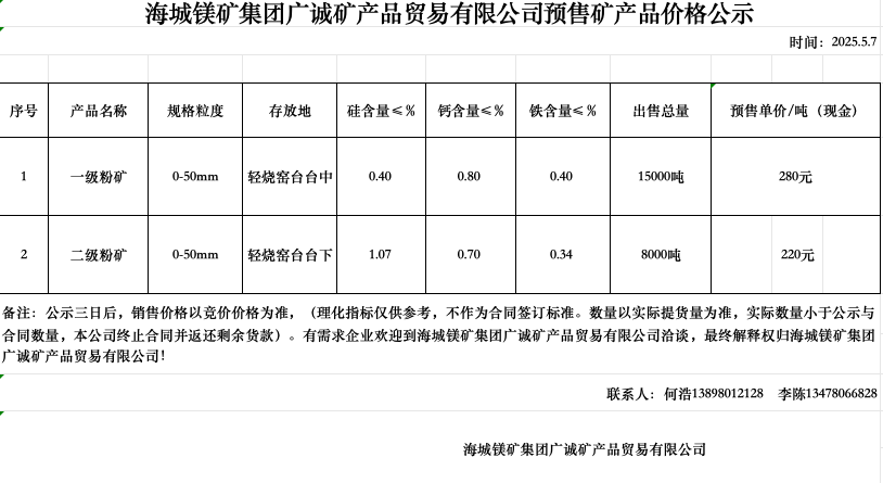 海城鎂礦集團廣誠礦產(chǎn)品貿(mào)易有限公司預(yù)售礦產(chǎn)品價格公示