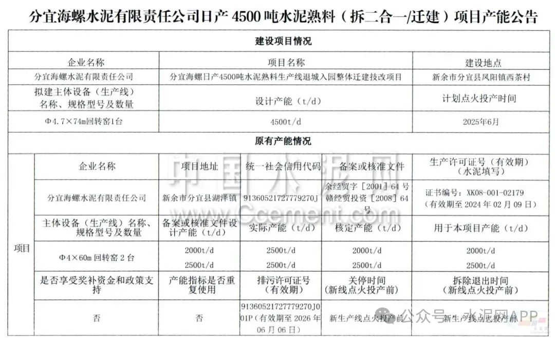 據(jù)了解,2023年11月,江西工信廳發(fā)布“關于分宜海螺水泥有限責任公司日產(chǎn)4500噸水泥熟料項目產(chǎn)能的公告”稱,分宜海螺水泥擬實施水泥熟料生產(chǎn)線退城入園整體遷建技改項目,將建一條4500t/d熟料生產(chǎn)線,退出公司原有的一條2500t/d及一條2000t/d熟料生產(chǎn)線。