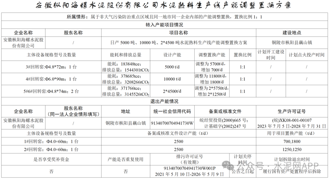 5月13日,安徽省工信廳發(fā)布“關(guān)于安徽樅陽海螺水泥股份有限公司水泥熟料生產(chǎn)線項目產(chǎn)能調(diào)整置換方案的公示”。