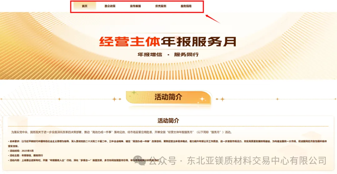 三、進(jìn)入“經(jīng)營(yíng)主體年報(bào)服務(wù)月”頁(yè)面后,可在上方選擇不同的子頁(yè)面閱覽各類信息,通過(guò)“惠企政策”“宣傳展播”“優(yōu)秀案例”等專欄可充分了解年報(bào)報(bào)送要求、注意事項(xiàng)、常見(jiàn)問(wèn)題等信息,幫助大家更高效地掌握年報(bào)重點(diǎn),提前規(guī)避可能存在的“坑”。