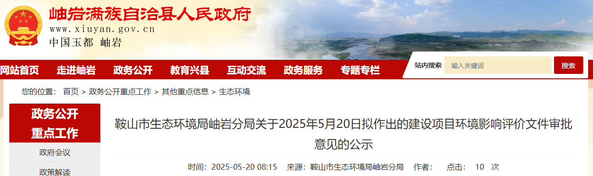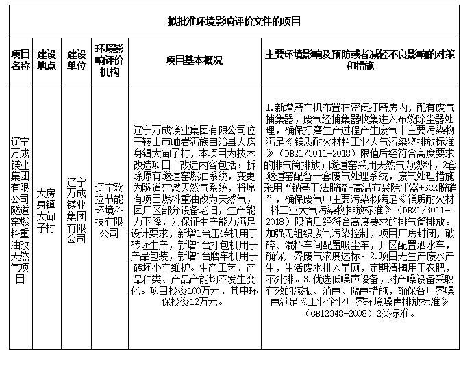 根據(jù)建設(shè)項(xiàng)目環(huán)境影響評價(jià)審批程序的有關(guān)規(guī)定,經(jīng)審查,岫巖縣生態(tài)環(huán)境局?jǐn)M對《遼寧萬成鎂業(yè)集團(tuán)有限公司隧道窯燃料重油改天然氣項(xiàng)目環(huán)境影響報(bào)告表》作出審批意見。為保證此次審查工作的嚴(yán)肅性和公正性,現(xiàn)將擬作出審批意見的環(huán)境影響評價(jià)文件基本情況予以公示,公示期為5個(gè)工作日。聽證權(quán)利告知:依據(jù)《中華人民共和國行政許可法》,自公示起五日內(nèi)申請人、利害關(guān)系人可對以下擬作出的建設(shè)項(xiàng)目環(huán)境影響評價(jià)文件審批意見要求聽證。