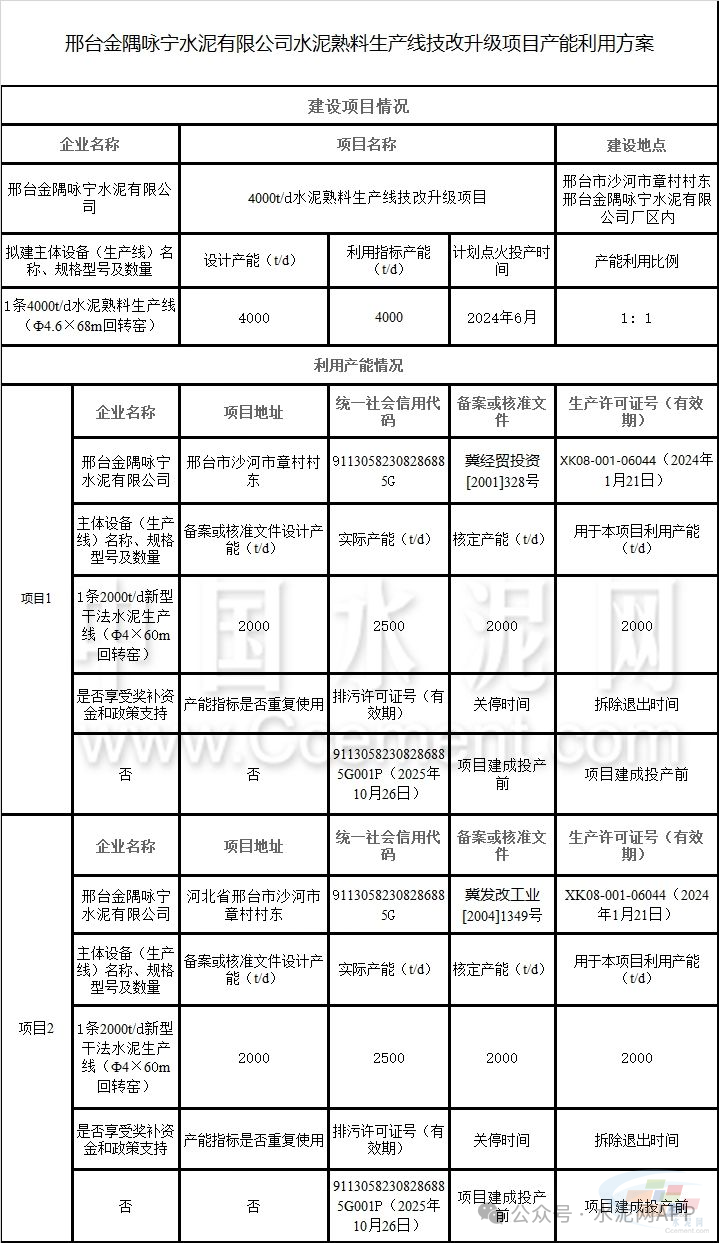 2022年2月15日,邢臺金隅詠寧水泥有限公司水泥熟料生產(chǎn)線技術(shù)改造項目產(chǎn)能利用方案在我廳門戶網(wǎng)站進行公告。因企業(yè)發(fā)展戰(zhàn)略調(diào)整,邢臺金隅詠寧水泥有限公司申請撤銷該產(chǎn)能利用方案。按照《水泥玻璃行業(yè)產(chǎn)能置換實施辦法(2024年本)》(工信部原〔2024〕206號)要求,經(jīng)研究,現(xiàn)將邢臺金隅詠寧水泥有限公司水泥熟料生產(chǎn)線技術(shù)改造項目產(chǎn)能利用方案予以撤銷,歡迎社會公眾進行監(jiān)督。據(jù)了解,該項目原計劃建設(shè)4000t/d熟料生產(chǎn)線,拆除退出現(xiàn)有2條水泥熟料生產(chǎn)線回轉(zhuǎn)窯全部。產(chǎn)能置換方案見下: