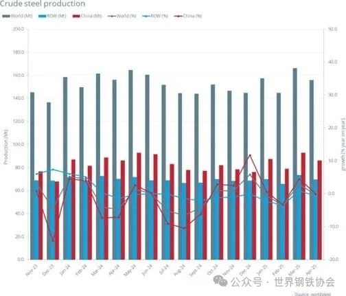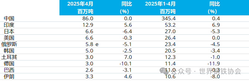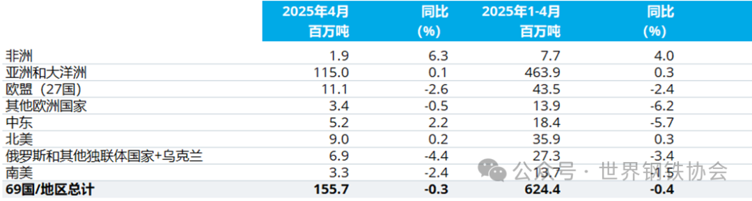 2025年4月全球69個納入世界鋼鐵協(xié)會統(tǒng)計國家/地區(qū)的粗鋼產(chǎn)量為1.557億噸,同比下降0.3%。