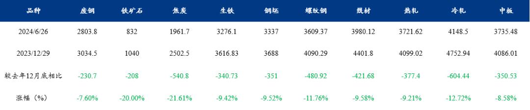 2024年上半年已經(jīng)過(guò)去,黑色系各品種均出現(xiàn)了不同幅度的下跌,其中:廢鋼跌幅7.60%;鐵礦石跌幅20.00%;焦炭跌幅21.61%;鋼坯跌幅9.52%;螺紋鋼跌幅11.76%;熱軋、冷軋和中板跌幅分別為9.21%、12.72%和8.58%。