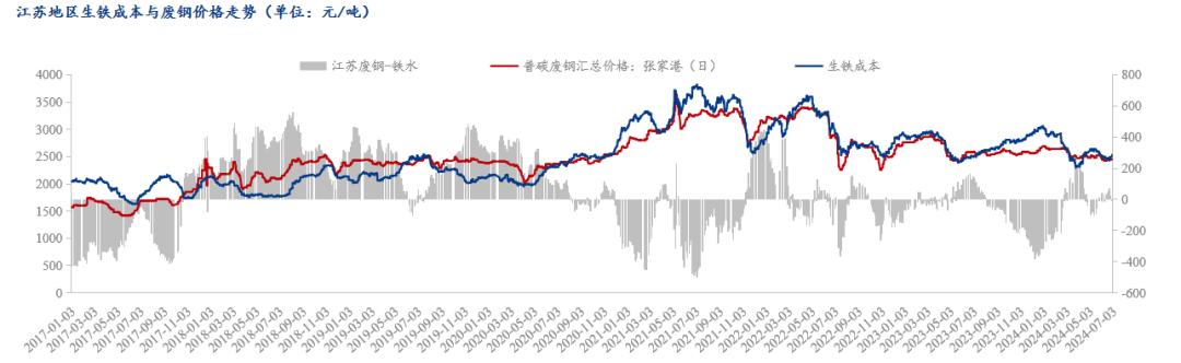 2024年上半年,鐵廢差來(lái)看,廢鋼多數(shù)時(shí)間仍是倒掛鐵水成本,鐵廢差平均值-36.68元/噸,較2023年平均值-55元/噸回升18.32元/噸,廢鋼整體性價(jià)比優(yōu)勢(shì)較2023年有所減弱。