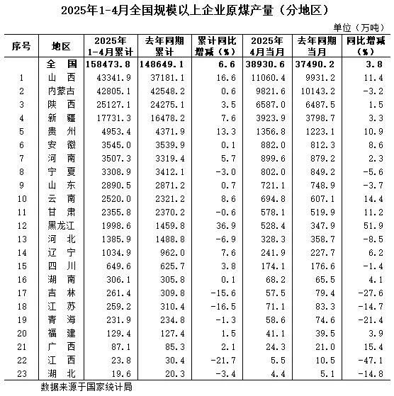 2025年1-4月份全國規(guī)模以上分省區(qū)原煤產(chǎn)量數(shù)據(jù)發(fā)布
