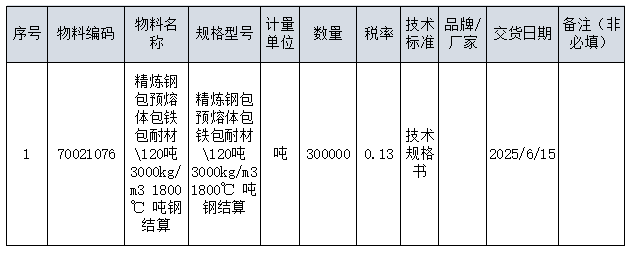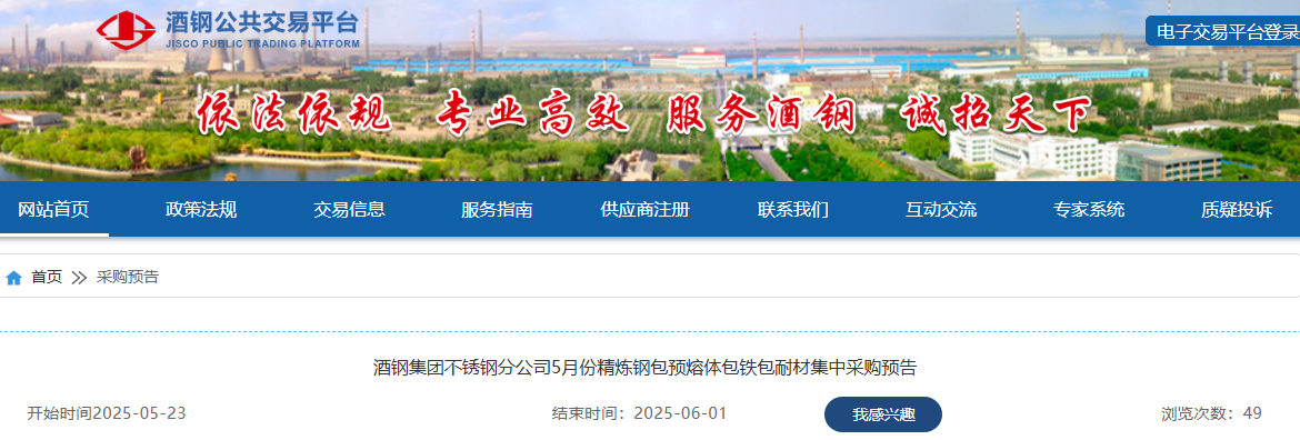 項目名稱:酒鋼集團不銹鋼分公司5月份精煉鋼包預(yù)熔體包鐵包耐材集中采購預(yù)告