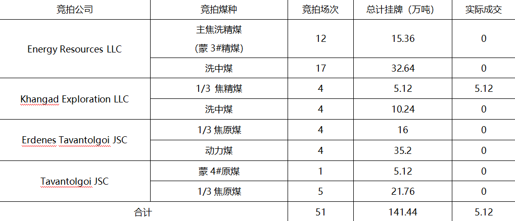 蒙古國(guó)煤炭電子競(jìng)拍市場(chǎng)繼續(xù)呈現(xiàn)供需寬松格局,價(jià)格下行壓力進(jìn)一步加大。從市場(chǎng)表現(xiàn)來(lái)看,ER公司的主焦精煤及動(dòng)力煤線上競(jìng)拍依然無(wú)人問(wèn)津,延續(xù)了全面流拍的態(tài)勢(shì);KH公司1/3焦精煤雖然以605元/噸的價(jià)格成交1.28萬(wàn)噸,但較上周成交價(jià)大幅下跌65元/噸,反映出市場(chǎng)采購(gòu)意愿持續(xù)走弱。