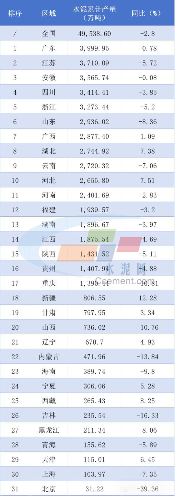 1-4月全國(guó)及地區(qū)水泥產(chǎn)量