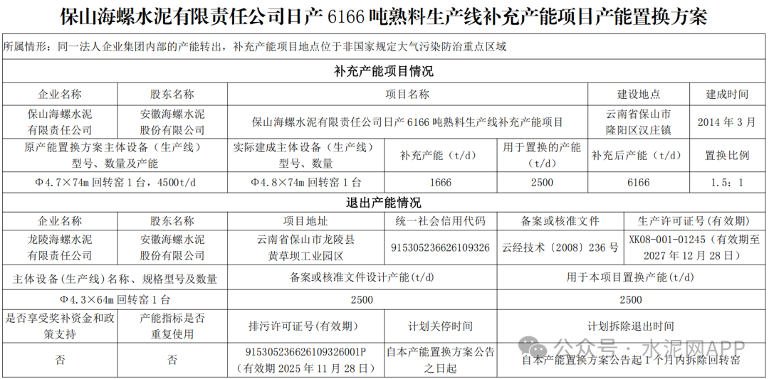 根據(jù)公示,保山海螺水泥有限責(zé)任公司日產(chǎn)6166噸熟料生產(chǎn)線補(bǔ)充產(chǎn)能項(xiàng)目補(bǔ)充產(chǎn)能1666t/d,置換比例1.5:1。出讓的2500t/d熟料產(chǎn)能來(lái)自龍陵海螺水泥,自本產(chǎn)能置換方案公告起1個(gè)月內(nèi)拆除回轉(zhuǎn)窯。