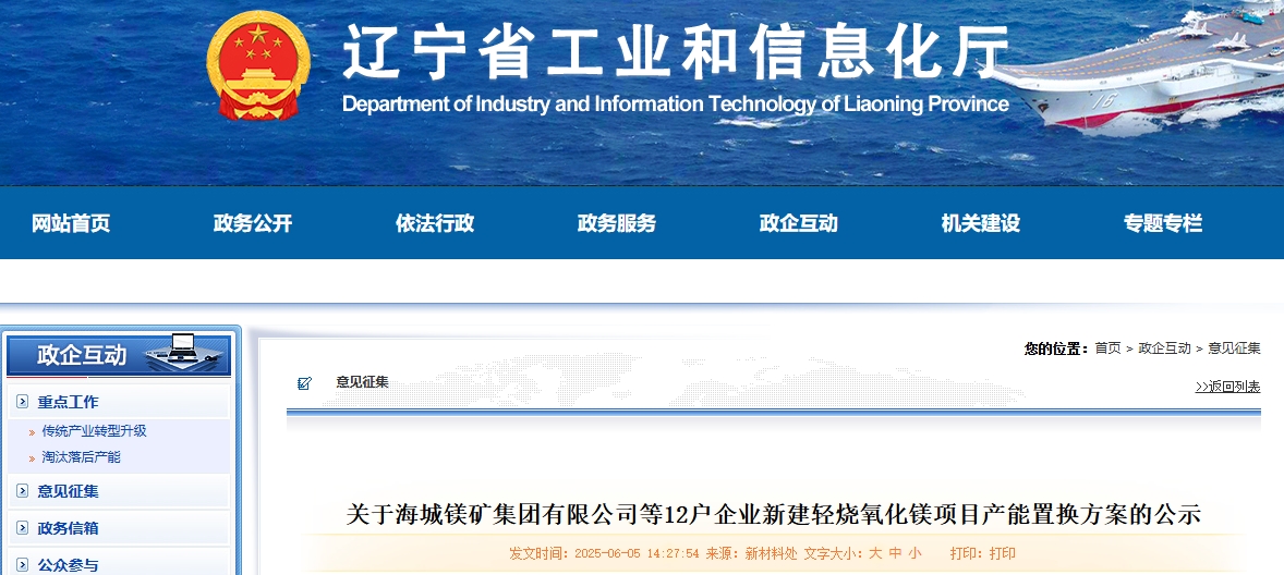 按照《遼寧省人民政府辦公廳關(guān)于推進(jìn)菱鎂行業(yè)高質(zhì)量發(fā)展的實(shí)施意見》(遼政辦發(fā)〔2023〕15號)、《遼寧省菱鎂礦浮選及鎂砂行業(yè)產(chǎn)能置換辦法》(遼工信建材〔2024〕18號)要求,根據(jù)菱鎂行業(yè)專項整治工作進(jìn)展,經(jīng)企業(yè)申請、市工信部門初審、我廳審核,現(xiàn)將海城鎂礦集團(tuán)有限公司等12戶企業(yè)新建輕燒氧化鎂項目產(chǎn)能置換方案予以公示,公示期10個工作日。