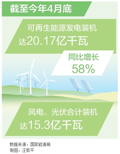 記者近日從國家能源局獲悉:截至今年4月底,我國可再生能源發(fā)電裝機(jī)已突破20億千瓦,達(dá)到20.17億千瓦,這約等于90個(gè)三峽電站的總裝機(jī),同比增長58%。其中,風(fēng)電、光伏合計(jì)裝機(jī)達(dá)到15.3億千瓦,超過火電裝機(jī)。2024年,我國可再生能源新增裝機(jī)3.73億千瓦,已連續(xù)兩年突破3億千瓦,在全球新增裝機(jī)的占比超過50%。