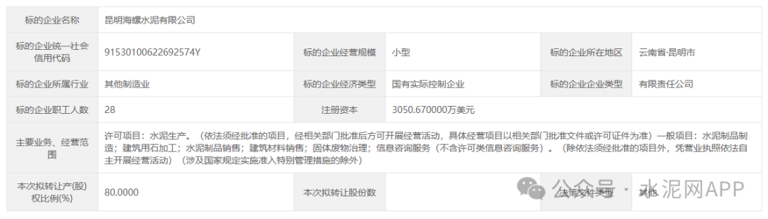 據(jù)某產(chǎn)權(quán)交易平臺(tái)顯示,近日昆明海螺水泥有限公司80%股權(quán)及19,503萬(wàn)元債權(quán)轉(zhuǎn)讓預(yù)公告發(fā)布。該企業(yè)由海螺水泥持股80%,德宏發(fā)展持股20%。