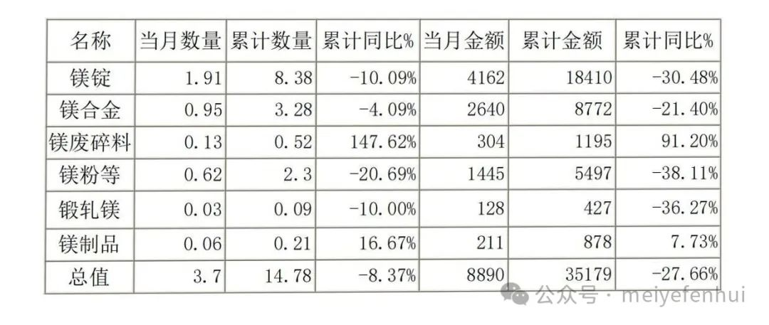 2025年1-4月中國各類鎂產(chǎn)品出口統(tǒng)計情況 (單位:萬噸、萬美元)