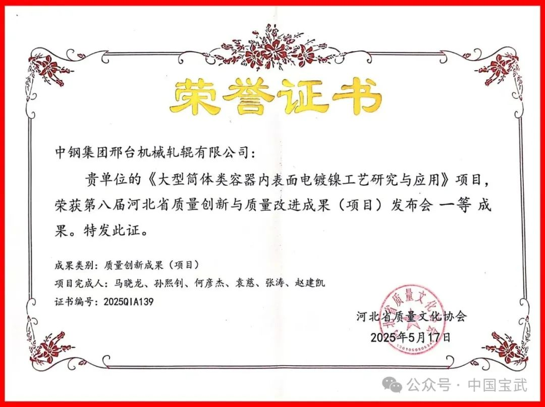 近日,在第八屆河北省質量創(chuàng)新與質量改進成果發(fā)布會暨經(jīng)驗交流會上,寶武智維、寶武重工中鋼邢機《大型筒體類容器內(nèi)表面電鍍鎳工藝研究與應用》《打造熱處理數(shù)字化車間》《無縫鋼管用超高性能軋輥技術研究及應用》3項質量創(chuàng)新成果,從168項入圍成果中脫穎而出分別榮獲一等獎和二等獎。