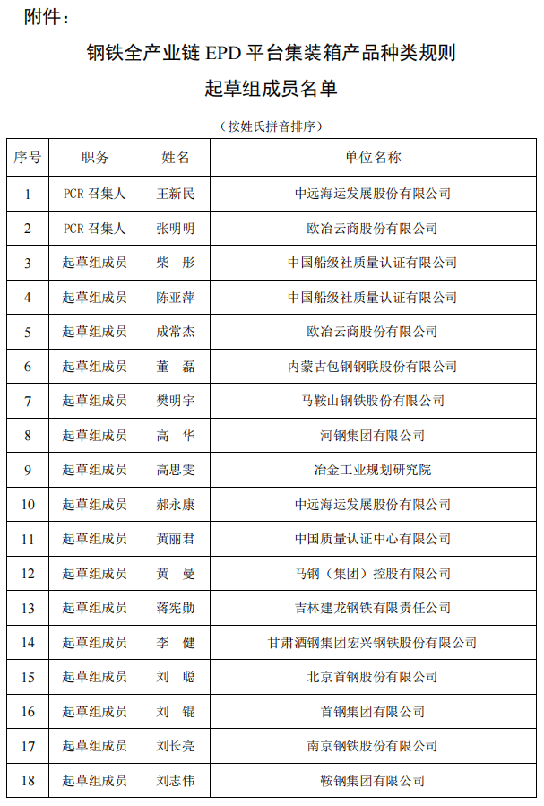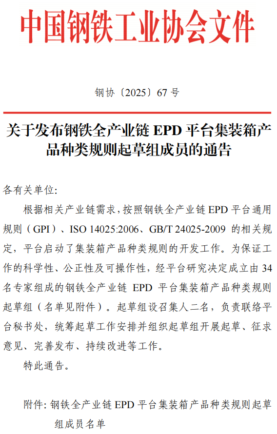 關于發(fā)布鋼鐵全產業(yè)鏈EPD平臺集裝箱產品種類規(guī)則起草組成員的通告