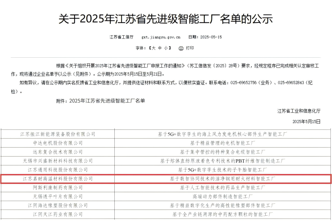 近日,江蘇省工業(yè)和信息化廳公布2025年先進級智能工廠名單,江蘇嘉耐高溫材料股份有限公司依托“基于數(shù)智協(xié)同技術(shù)的潔凈鋼用耐火材料智能工廠”成功入選“江蘇省先進級智能工廠”名單↓