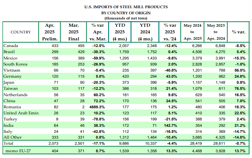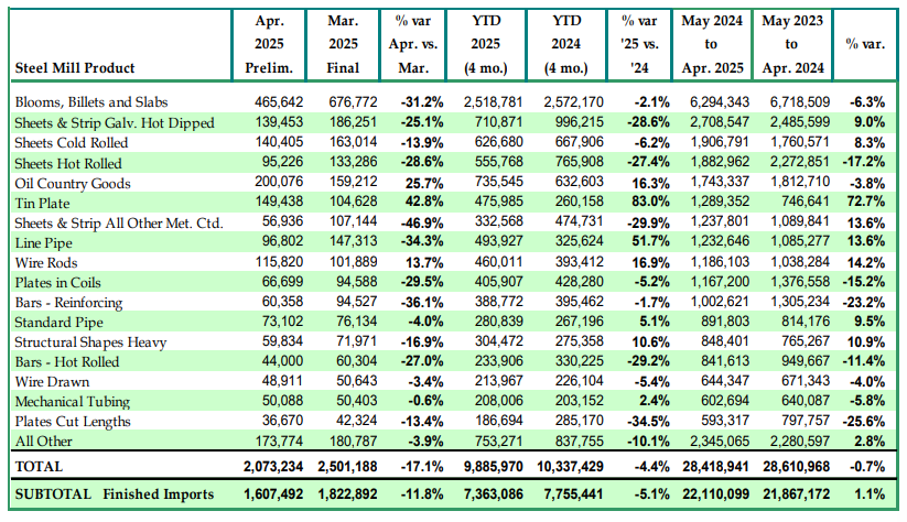 美國鋼鐵協(xié)會(AISI)報告稱,2025年4月份,美國鋼材進口量207.3萬凈噸(NT),環(huán)比下降17.1%,同比下降26%;其中成品鋼進口量160.7萬凈噸(NT),環(huán)比下降11.8%。
