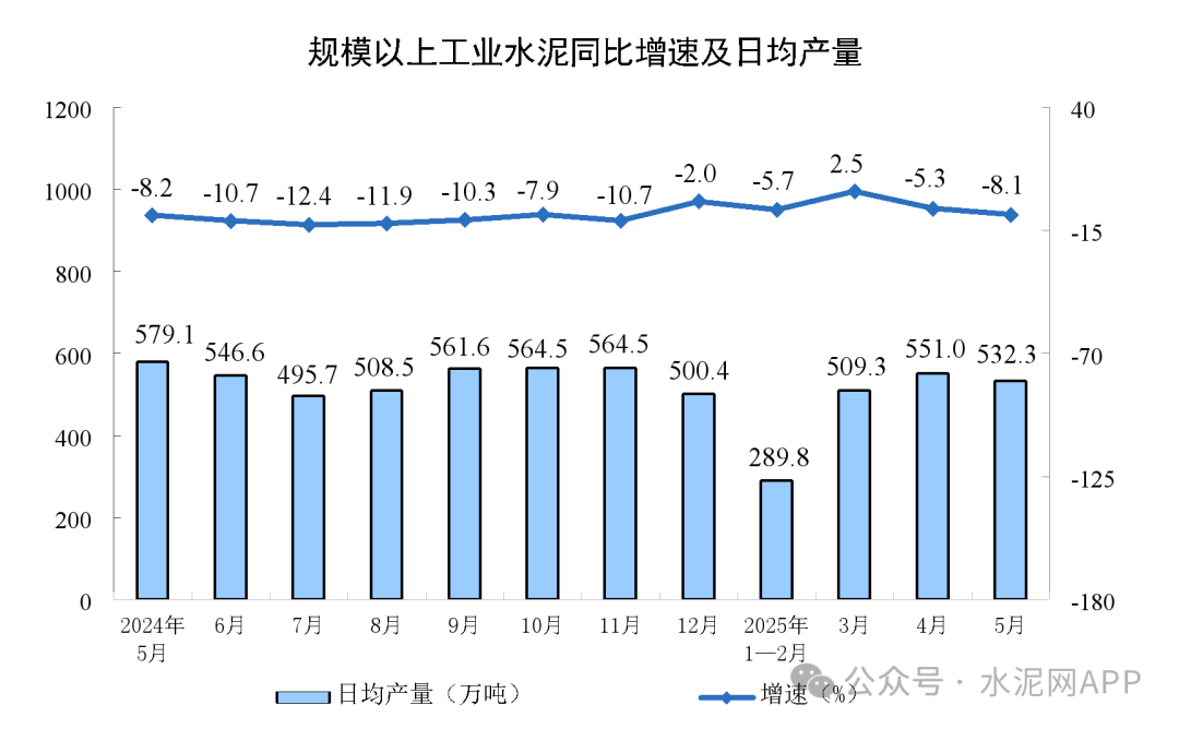 6月16日,國家統(tǒng)計局公布了5月份國民經(jīng)濟相關數(shù)據(jù)。5月份,規(guī)模以上工業(yè)增加值同比實際增長5.8%(增加值增速均為扣除價格因素的實際增長率)。從環(huán)比看,5月份,規(guī)模以上工業(yè)增加值比上月增長0.61%。1—5月份,規(guī)模以上工業(yè)增加值同比增長6.3%。其中5月份水泥產(chǎn)量16500萬噸,同比下降8.1%;1-5月份水泥產(chǎn)量65939萬噸,同比下降4%。此外,數(shù)據(jù)顯示,2024年1-5月全國水泥產(chǎn)量為68727萬噸,由此計算,今年1-5月水泥全口徑產(chǎn)量比去年同期減少2788萬噸,降幅4.06%。