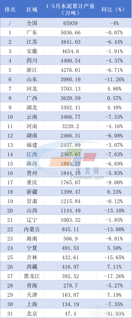 國家統(tǒng)計局數(shù)據(jù)顯示,5水泥產(chǎn)量為1.65億噸,同比下降8.1%;1-5月水泥產(chǎn)量為6.59億噸,同比下降4.0%。