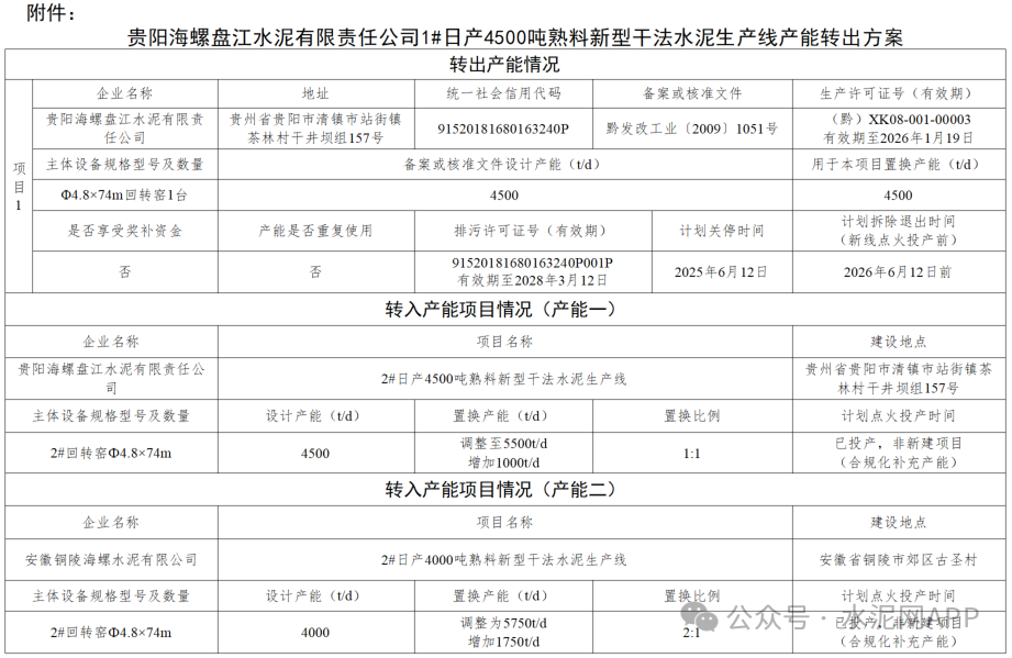 近日,貴州省工信廳接連發(fā)布3則海螺水泥產(chǎn)能轉(zhuǎn)出方案,共計3*4500t/d熟料生產(chǎn)線,轉(zhuǎn)出產(chǎn)能多用于安徽海螺企業(yè)。具體如下:6月20日,貴州省工信廳發(fā)布“關于貴陽海螺盤江水泥有限責任公司1#日產(chǎn)4500噸熟料新型干法水泥生產(chǎn)線產(chǎn)能轉(zhuǎn)出方案的公示”。