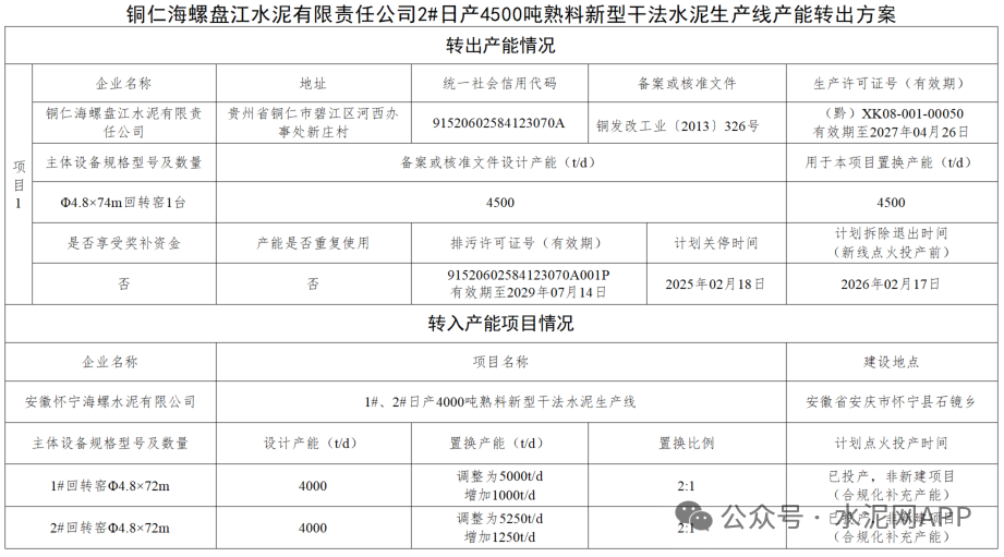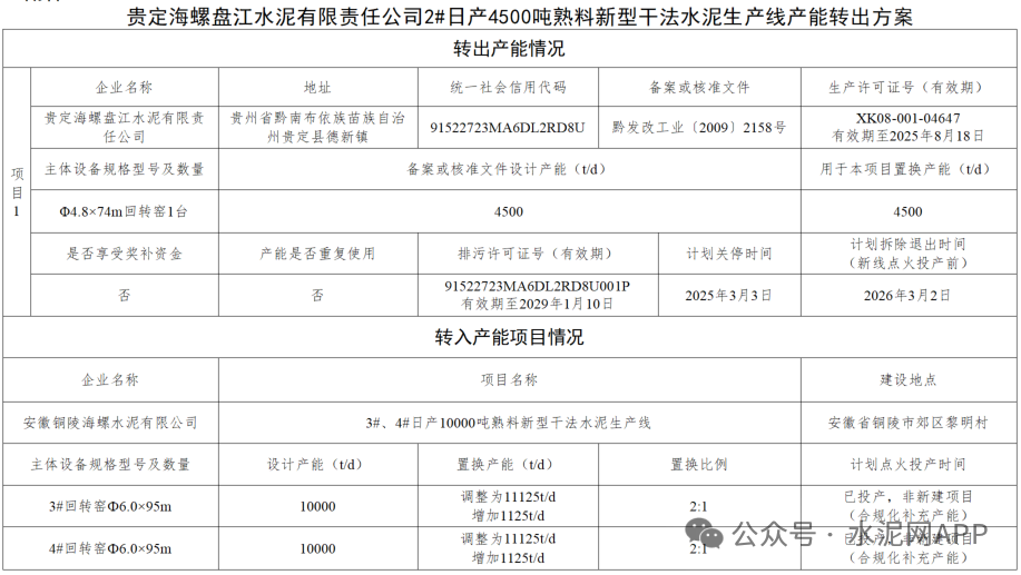 公示顯示,貴陽海螺盤江水泥退出一條4500t/d熟料生產(chǎn)線,產(chǎn)能用于補充同廠區(qū)2#4500t/d熟料生產(chǎn)線,及安徽銅陵海螺2#4000t/d熟料生產(chǎn)線。