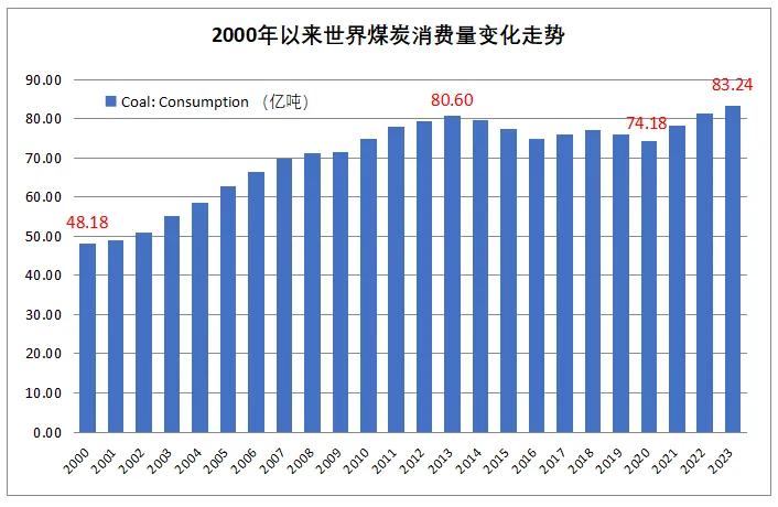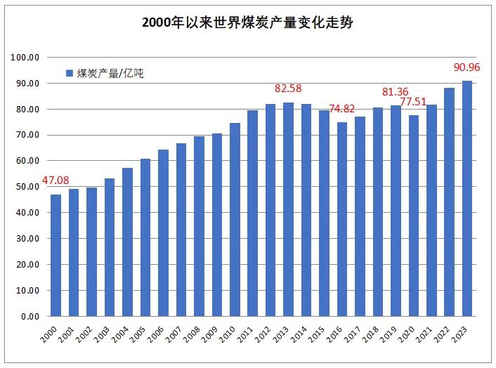 統(tǒng)計(jì)年鑒數(shù)據(jù)顯示,2023年,世界煤炭總產(chǎn)量為90.957億噸(179.24艾焦耳),比2022年增長3.1%,全球產(chǎn)量首次突破90億噸,創(chuàng)出歷史新紀(jì)錄。