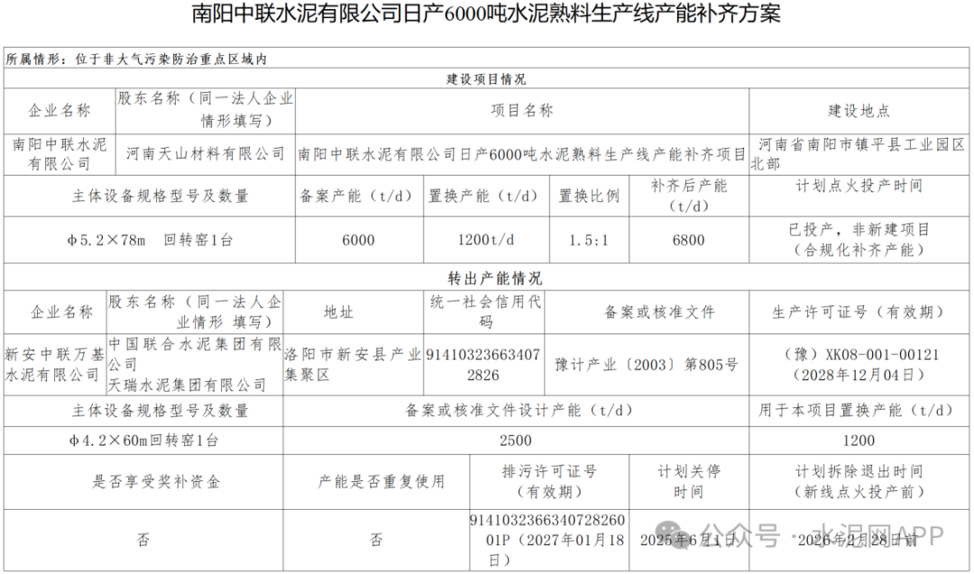 公示顯示,南陽中聯(lián)水泥有限公司日產(chǎn)6000噸水泥熟料生產(chǎn)線置換補(bǔ)充產(chǎn)能800t/d,補(bǔ)齊后產(chǎn)能6800t/d,置換比例1.5:1。退出產(chǎn)能來自新安中聯(lián)萬基水泥2500t/d生產(chǎn)線,用于本項(xiàng)目置換產(chǎn)能1200t/d,該生產(chǎn)線計(jì)劃2025年6月1日關(guān)停,2026年2月28日前拆除退出。
