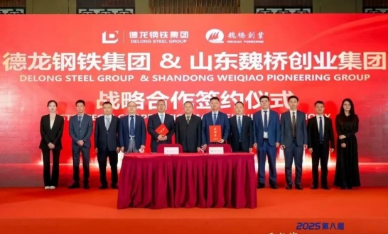 06月26日上午,德龍鋼鐵集團與山東魏橋創(chuàng)業(yè)集團在天津舉行戰(zhàn)略合作框架協(xié)議簽約儀式。在天津市鋼鐵工業(yè)協(xié)會秘書長楊勇、副秘書長時東生及現(xiàn)場百余位嘉賓的共同見證下,德龍鋼鐵集團營銷中心總經(jīng)理李君亮、宏橋國際貿(mào)易有限公司總經(jīng)理劉健康分別代表雙方簽約。