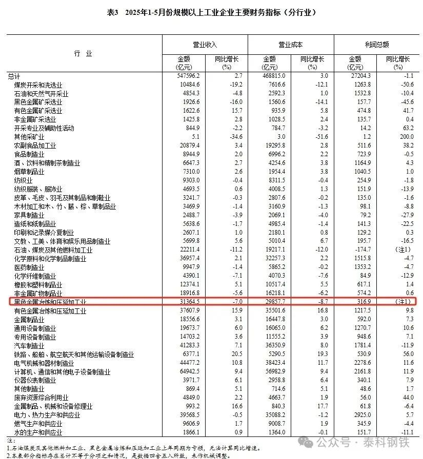 1—5月份,黑色金屬冶煉和壓延加工業(yè)利潤總額316.9億元。2024年同期1-5月,黑色金屬冶煉和壓延加工業(yè)實現(xiàn)營業(yè)收入32891.2億元,同比下降3.3%;營業(yè)成本31915.2億元,同比下降2.9%;虧損127.2億元。