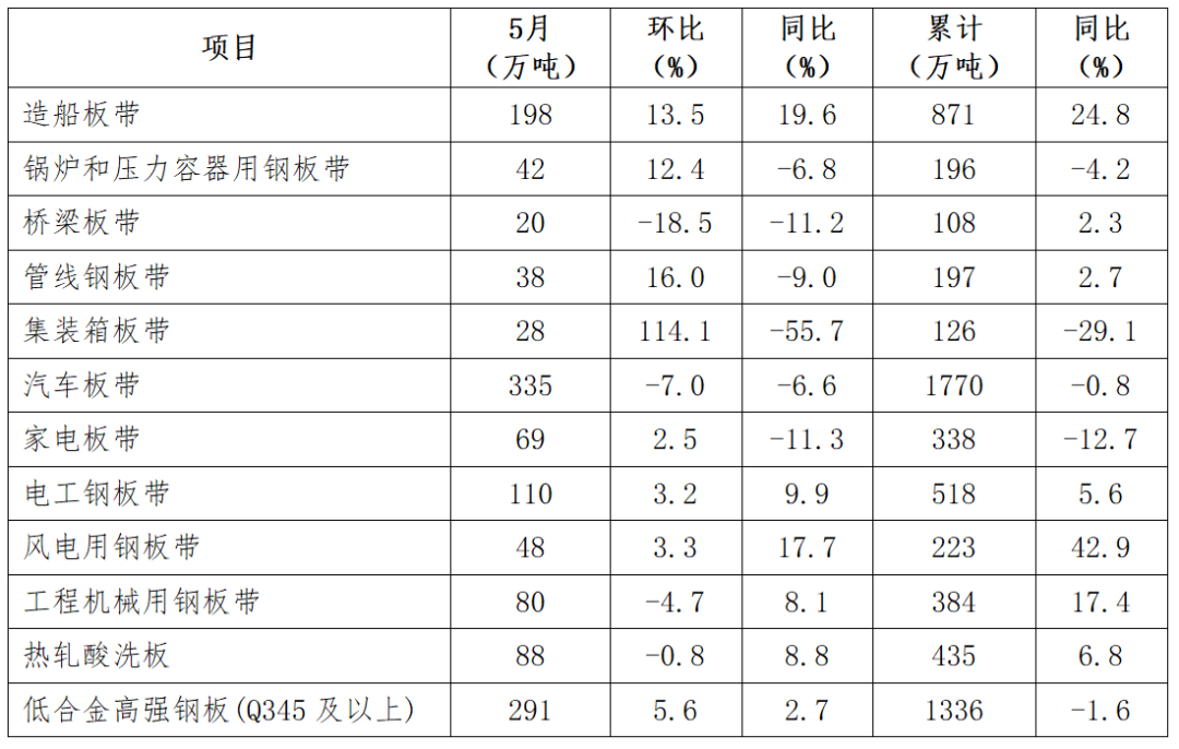 2025年5月,重點統(tǒng)計企業(yè)主要品種板中,造船板、風電用鋼板產(chǎn)量同比增幅較大;集裝箱板、橋梁板、家電板產(chǎn)量同比降幅較大。