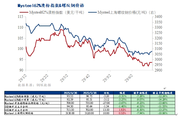 截至目前,Mysteel62%澳粉遠(yuǎn)期價(jià)格指數(shù)93.55美元/噸,環(huán)比下跌3.2美元/噸,跌幅3.31%。上海螺紋鋼價(jià)格3130元/噸,環(huán)比 上漲10元/噸,漲幅0.32%。