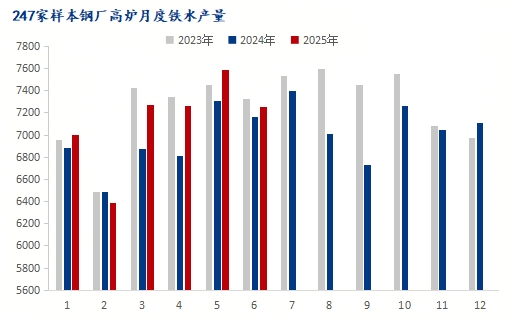 需求端方面,6月鋼鐵出口在90天關(guān)稅暫停期內(nèi)繼續(xù)維持較高水平,下游需求走弱程度有限,產(chǎn)業(yè)及鐵礦石自身基本面矛盾累積速度偏慢,鋼廠減產(chǎn)壓力較小,在淡季以及行政減產(chǎn)到來前抓緊生產(chǎn)兌現(xiàn)利潤動力較足,6月日均鐵水產(chǎn)量整體在241-242萬噸之間窄幅波動,多數(shù)為年中短期高爐檢修,未出現(xiàn)規(guī)模性持續(xù)減產(chǎn)。
