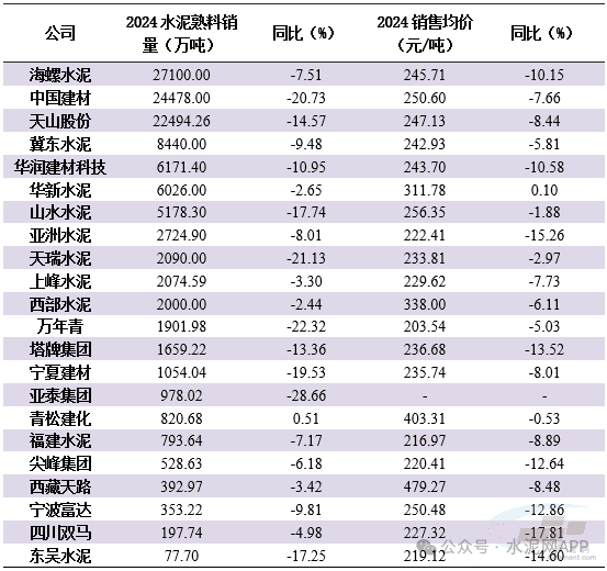 表2:2024主要水泥上市公司水泥熟料銷售和均價情況