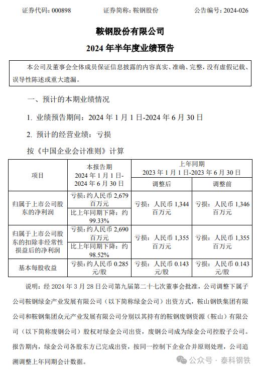 鞍鋼股份:預(yù)計(jì)1-6月虧損26.79億元