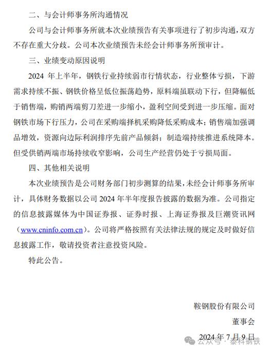 鞍鋼股份7月9日發(fā)布業(yè)績(jī)預(yù)告,預(yù)計(jì)2024年1-6月歸屬凈利潤(rùn)虧損約26.79億元。公告中解釋本次業(yè)績(jī)變動(dòng)的原因?yàn)椋?024 年上半年,鋼鐵行業(yè)持續(xù)弱市行情狀態(tài),行業(yè)整體虧損,下游需求持續(xù)不振、鋼鐵價(jià)格呈低位振蕩趨勢(shì),原料端雖聯(lián)動(dòng)下行,但降幅低于銷售端,購(gòu)銷兩端剪刀差進(jìn)一步縮小,盈利空間受到進(jìn)一步壓縮。面對(duì)鋼鐵市場(chǎng)下行壓力,公司在采購(gòu)端擇機(jī)采購(gòu)降低采購(gòu)成本;銷售端加強(qiáng)調(diào)品增效,資源向邊際利潤(rùn)排序先前產(chǎn)品傾斜;制造端持續(xù)推進(jìn)系統(tǒng)降本。但受供銷兩端市場(chǎng)持續(xù)收窄影響,公司生產(chǎn)經(jīng)營(yíng)仍處于虧損局面。鞍鋼股份2024年一季報(bào)顯示,公司主營(yíng)收入273.43億元,同比下降11.35%;歸母凈利潤(rùn)-16.57億元,同比下降1012.08%;扣非凈利潤(rùn)-16.88億元,同比下降1025.33%;負(fù)債率45.29%,投資收益1.0億元,財(cái)務(wù)費(fèi)用5600.0萬元,毛利率-3.45%。