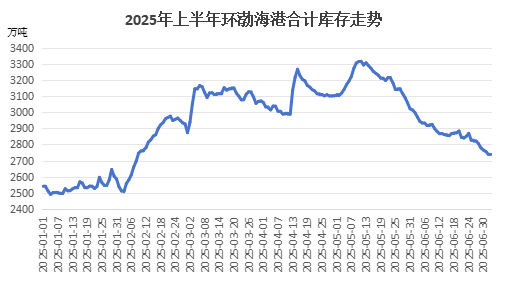 上半年由于煤炭供需關(guān)系持續(xù)寬松,煤價不斷下行,跌幅均值在20%以上。產(chǎn)量方面,2025年上半年國內(nèi)原煤產(chǎn)量整體保持同比增長趨勢,據(jù)國家統(tǒng)計局?jǐn)?shù)據(jù),1-5月全國原煤產(chǎn)量達(dá)到19.9億噸,同比增長6%;庫存方面,上半年北方港口煤炭庫存整體持續(xù)處于歷史偏高水平,持續(xù)累庫至5月月中創(chuàng)歷史最高水平后回落,截至6月30日環(huán)渤海港合計煤炭庫存在2765.4萬噸,較年初累計增加224.4萬噸,增幅在8.83%。