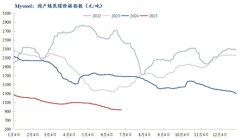 回顧2025年上半年的煉焦煤市場,過剩的壓力和悲觀的預(yù)期依舊壓制煉焦煤持續(xù)下跌。雖然從下游鐵水數(shù)據(jù)來看,剛需較去年同比有所回升。但供應(yīng)過剩、市場信心缺失依舊導(dǎo)致煉焦煤價格延續(xù)去年單邊下行的行情走勢,各煤種價格已降至8年內(nèi)新低。雖然在三月底四月初煤價出現(xiàn)曇花一現(xiàn)般短暫上漲,但總體跌勢不改,基本面矛盾持續(xù)加劇,市場悲觀情緒蔓延,投機市場活躍度持續(xù)降低,上游庫存持續(xù)高壓。展望下半年市場,煤炭供應(yīng)在低價格壓制之下將有收縮預(yù)期,但煤礦全年生產(chǎn)任務(wù)仍需完成,國內(nèi)煤炭大幅減產(chǎn)難度較大,進口煤需求下滑,通關(guān)量有小幅減量的可能。而需求側(cè)鋼廠由于盈利狀況尚可,短期高爐減產(chǎn)力度不大,但隨著成材消費下滑以及出口壓力加大,下半年鐵水產(chǎn)量環(huán)比下滑仍是大概率事件。因此下半年煉焦煤市場基本面仍將維持寬松格局,但由于煤價下行已逼近煤礦生產(chǎn)成本,高成本煉焦煤資源已被擠出,煉焦煤價格底部顯現(xiàn),煤礦讓利空間有限,預(yù)計行情降幅將小于上半年,煤價加速下跌的時期已經(jīng)過去,后續(xù)價格博弈將更為激烈,不排除階段性供需錯配引發(fā)行情短期波動。