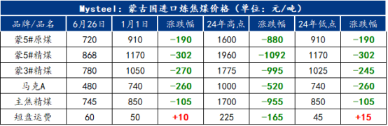 國內(nèi)雙焦市場弱勢運行,進口蒙古國煉焦煤隨之下跌,口岸各煤種銷售價格從年初高位逐月下滑,現(xiàn)已接近貿(mào)易企業(yè)成本線,但短盤運費、監(jiān)管區(qū)倉儲等固定成本費用變化不大,口岸貿(mào)易企業(yè)利潤空間不斷受到擠壓。部分企業(yè)近期暫停拉運,轉(zhuǎn)向消化監(jiān)管區(qū)現(xiàn)有庫存,等待三季度市場行情。截止6月26日甘其毛都口岸蒙5#原煤口岸提貨含稅價720元/噸,環(huán)比年初下跌190元/噸;蒙5#精煤烏不浪口金泉工業(yè)園區(qū)含稅價868元/噸,環(huán)比年初下跌302元/噸;甘其毛都口岸蒙3#精煤口岸提貨含稅價780元/噸,環(huán)比年初下跌270元/噸;策克口岸馬克A原煤含稅價480元/噸,環(huán)比年初下跌260元/噸;滿都拉主焦精煤含稅價745元/噸,環(huán)比年初下跌105元/噸。但與之對應(yīng)的甘其毛都口岸短盤運費60元/噸,環(huán)比年初上漲10元/噸。