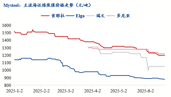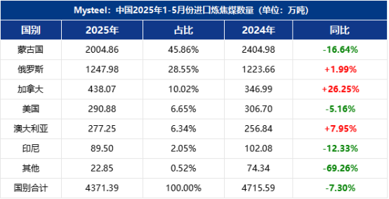 據(jù)海關(guān)總署最新數(shù)據(jù)顯示,截止5月底,2025年中國進口量煉焦煤總計4371.39萬噸,同比下降7.3%?。其中,蒙古國作為我國進口煤的主要來源國,減量尤為明顯,年同比下降16.64%(-400.12萬噸)。2025年初三大口岸過貨量目標增長至8100萬噸,較2024年過貨量目標增長15.71%,較2024年實際完成過貨量增長8.0%。過貨目標增加導(dǎo)致口岸監(jiān)管區(qū)周轉(zhuǎn)壓力明顯,庫存持續(xù)高位,1月底至4月底連續(xù)三個月庫存在400萬噸以上,最高值超460萬噸,超出核定庫容32%。監(jiān)管區(qū)周轉(zhuǎn)壓力導(dǎo)致通關(guān)過貨不增反降,6月底甘其毛都口岸監(jiān)管區(qū)庫存再度突破至410萬噸附近,貿(mào)易企業(yè)拉運積極性不足,下半年蒙煤供應(yīng)難有大幅增長。根據(jù)Mysteel數(shù)據(jù),截止2025年5月底進口焦煤總量達到4371.39萬噸左右,其中海運煉焦煤進口2366.53萬噸,年同比微增2.42%左右,其中俄煤占據(jù)海運煉焦煤總量的52.73%。美國焦煤進口量第一季度并未顯示出頹勢,主要還是由于前期搶進口及國內(nèi)進口關(guān)稅的靈活期導(dǎo)致到港量維持相對高位,但是到二季度進口量開始下行。而我國國內(nèi)貿(mào)易環(huán)節(jié)認為美國焦煤進口在28%的進口關(guān)稅水平下仍然難改進口頹勢,在5月份進口量歸零。澳大利亞、加拿大的進口焦煤資源也因為中國一直為其機會市場,并沒有大范圍向我國發(fā)運,雖然加拿大、澳大利亞焦煤同比增加26.25%、7.95%,但是此兩者未能有效彌補美國焦煤進口暫歇形成的缺口。而從進口海運焦煤到港情況可以看出,俄羅斯主流礦山增加對我國國內(nèi)長協(xié)供應(yīng),4-5月其已經(jīng)重新回到海運焦煤到港量的頭部位置,每周到港量達到40-50萬噸左右。加拿大及澳大利亞焦煤資源到港波動性更強,源于國內(nèi)貿(mào)易及終端定期采買量有限、其礦山事故停產(chǎn)、且受到船運周期較長等因素影響到港。綜合全年來看,2025年中國進口煉焦煤總量或為1.05億噸,同比減少1600萬噸左右。