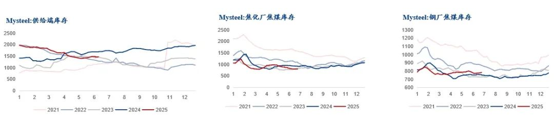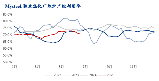 上半年煉焦煤需求維持相對高位,但顯性補庫需求較弱,下游煉焦煤持續(xù)去庫趨勢,始終保持低庫存采購策略。原料煤價格持續(xù)讓利下,焦企仍保持高位生產(chǎn)。2025上半年Mysteel全國獨立焦企開工率73.42%同比增3.9%,增幅較為明顯Mysteel鋼廠焦企開工86.9%同比下移0.21%,弱穩(wěn)運行。從獨立焦企看,上半年獨立焦企開工較為平穩(wěn)保持小幅上升趨勢,華北焦企用煤消耗高于去年同期水平,華東以及東北區(qū)域焦企開工率低于去年同期,疊加區(qū)域性用煤結(jié)構(gòu)或有差異,華北焦企庫存普遍低于去年同期水平。鋼廠焦企原料煤庫存相對平穩(wěn),生產(chǎn)節(jié)奏較為穩(wěn)定。上半年用煤消耗不減,低庫存采購仍能平衡生產(chǎn)端,中間環(huán)節(jié)需求量流動下較差,上半年煉焦煤需求對價格難有明顯驅(qū)動。下半年煉焦煤市場核心矛盾是對需求考驗,從宏觀經(jīng)濟,基建房地產(chǎn)仍有調(diào)控優(yōu)化政策出臺預(yù)期,政策環(huán)境以及方向仍相對友好,其次關(guān)稅貿(mào)易變化仍有具有不確定性,對市場情緒端仍有擾動。從下游需求看,鋼材出口市場轉(zhuǎn)弱以及疊加行政減產(chǎn)仍是不確定對原料仍有一定壓制。從焦化廠用煤采購看,下游仍受季節(jié)性影響,或推動結(jié)構(gòu)性補庫需求,當下下游庫存處于絕對低位,市場價格吻合預(yù)期下,不排除會有間接性補庫信號顯現(xiàn)。下半年從焦化廠產(chǎn)能釋放和投產(chǎn)看,下半年凈新增產(chǎn)能1459萬噸,主要分布山西、內(nèi)蒙等區(qū)域,如按期投產(chǎn)對原料煤實際消耗有效果增加。從利潤看需求,總體看下半年煉焦煤市場邊際需求或有減弱,季度性備庫需求和新增產(chǎn)能主導(dǎo)是否能夠有效帶動需求轉(zhuǎn)化,需求的風險更多集中在下游焦企利潤進一步擠兌后的主動減產(chǎn)力度以及鋼材出口轉(zhuǎn)弱風險對原料煤形成負反饋。