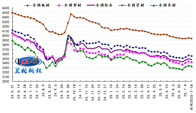 2025年第28周(2025.7.7-7.11)蘭格鋼鐵全國絕對價格指數(shù)為3492元,較上周上升0.9%,較去年同期下降9.6%;其中,蘭格鋼鐵長材絕對價格指數(shù)為3343元,較上周上升0.9%,較去年同期下降8.9%;蘭格鋼鐵型材絕對價格指數(shù)為3428元,較上周上升1.1%,較去年同期下降10.9%;蘭格鋼鐵板材絕對價格指數(shù)為3564元,較上周上升0.9%,較去年同期下降10.0%;蘭格鋼鐵管材絕對價格指數(shù)為3945元,較上周上升0.4%,較去年同期下降9.8%。