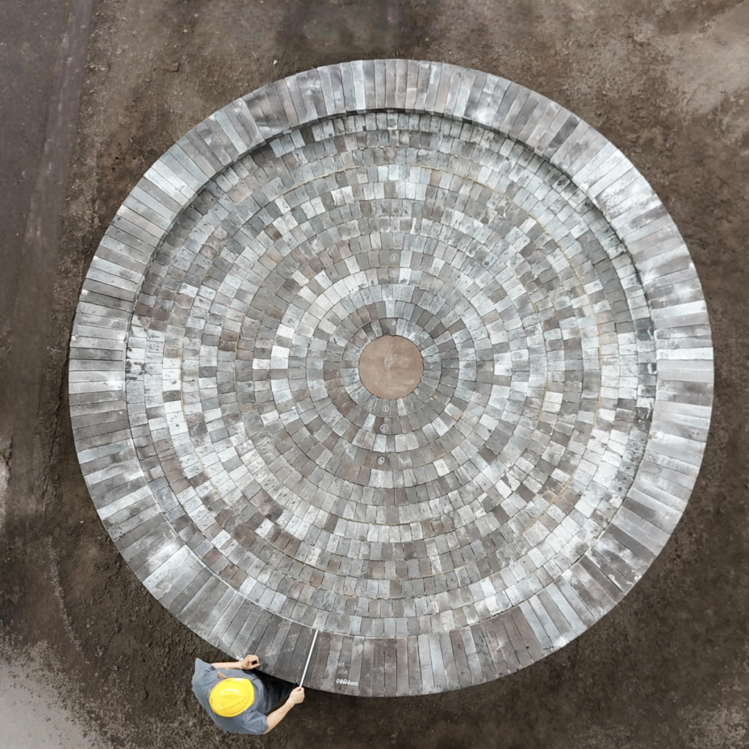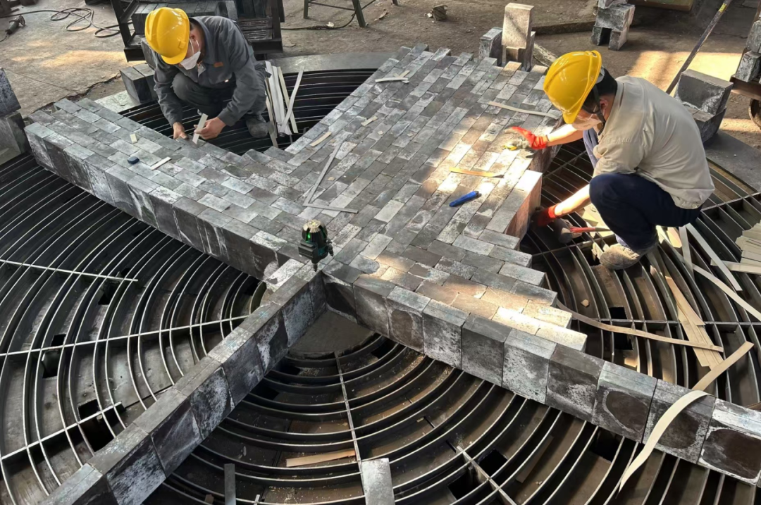 為保證沉降電爐砌筑與使用現(xiàn)場砌筑完全一致,鎂質(zhì)作業(yè)區(qū)耗時20多天啃下了技術(shù)難度極高的爐底預組“硬骨頭”,預組施工過程中,團隊秉持“毫米級”作業(yè)標準,根據(jù)“鍋底”弧度對2500余塊單磚進行個性化定制,并采用“犬牙交錯”的力學結(jié)構(gòu)錯縫砌筑,嚴格控制灰漿層厚度;同時使用專用弧形模具校準弧度、直徑、高度以確保爐體精度;膨脹縫處理上,對照設(shè)計圖紙,按不同區(qū)域、間距和膨脹系數(shù)填放膨脹紙板,確保熱應(yīng)力均勻分散。從基層處理到質(zhì)量驗收,每道工序均執(zhí)行高于行業(yè)標準的驗收規(guī)范。為保證每一層每一個磚型的精細化預組順利,預組工人常常蹲在爐底,一邊對照設(shè)計圖紙,一邊用工具細致調(diào)整,汗水浸透了工作服,卻依然全神貫注,不放過任何細節(jié),有效保證了整個預組工作的順利進行,為保證產(chǎn)品使用穩(wěn)定性奠定了堅實的基礎(chǔ)。