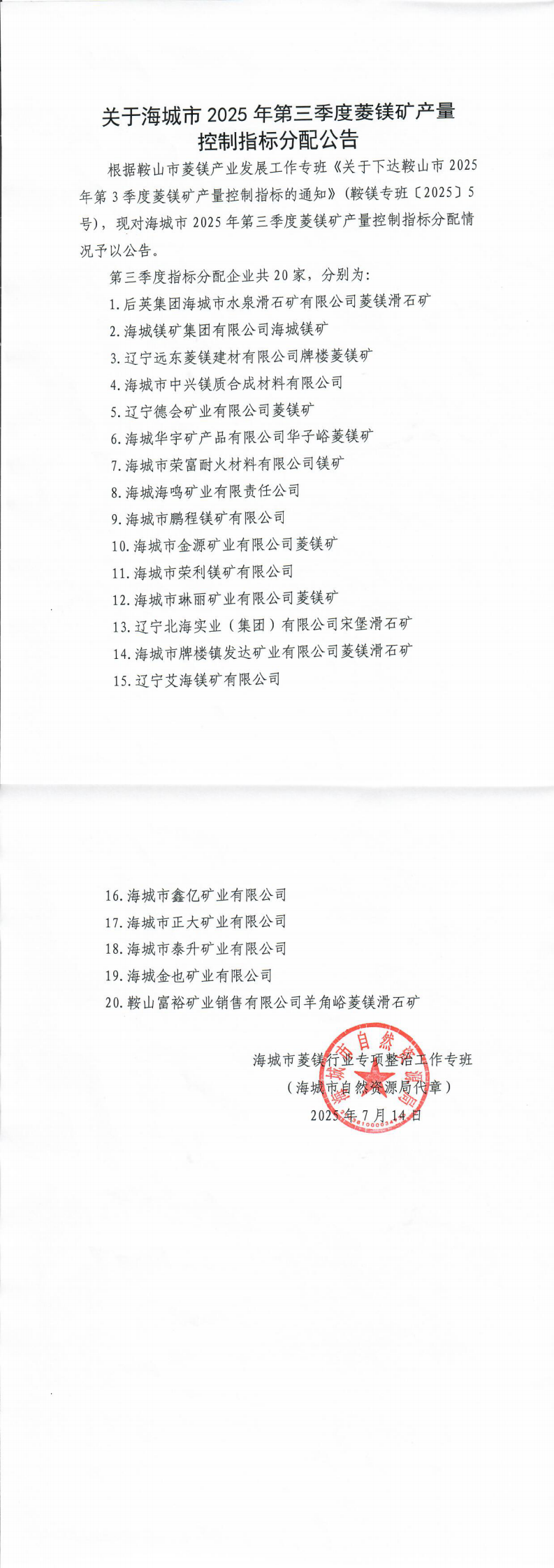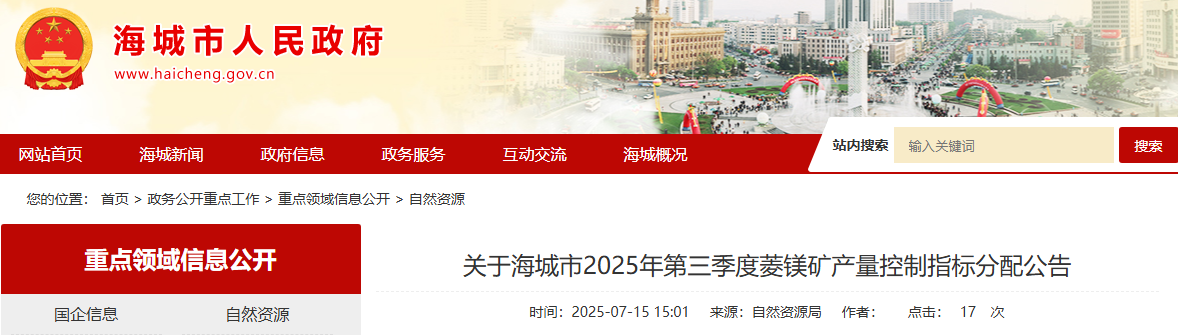 關于海城市2025年第三季度菱鎂礦產(chǎn)量控制指標分配公告