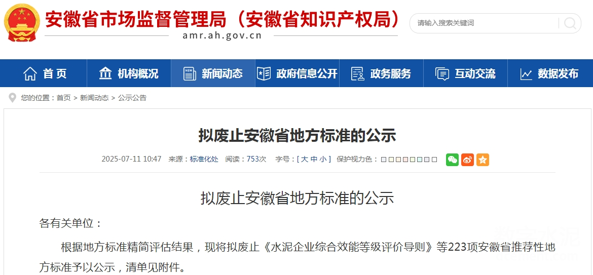 近日,安徽省市場監(jiān)督管理局標(biāo)準(zhǔn)化處發(fā)布《擬廢止安徽省地方標(biāo)準(zhǔn)的公示》稱,根據(jù)地方標(biāo)準(zhǔn)精簡評(píng)估結(jié)果,現(xiàn)將擬廢止《水泥企業(yè)綜合效能等級(jí)評(píng)價(jià)導(dǎo)則》等223項(xiàng)安徽省推薦性地方標(biāo)準(zhǔn)予以公示。
