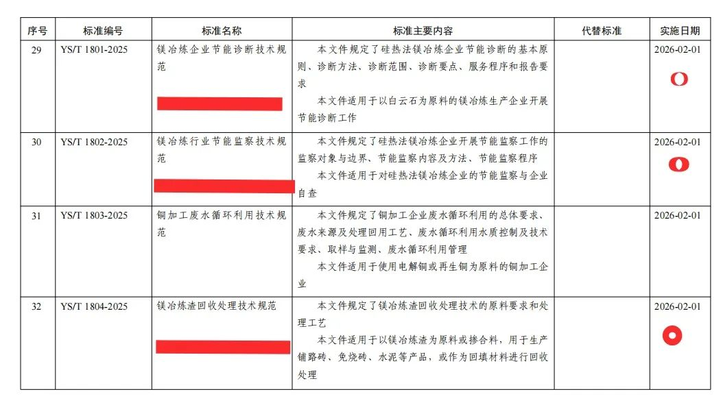 2025年7月8日,工業(yè)和信息化部正式公告批準(zhǔn)發(fā)布406項(xiàng)行業(yè)標(biāo)準(zhǔn),其中三項(xiàng)涉鎂——《鎂冶煉企業(yè)節(jié)能診斷技術(shù)規(guī)范》(YS/T 1801-2025)、《鎂冶煉行業(yè)節(jié)能監(jiān)察技術(shù)規(guī)范》(YS/T 1802-2025)及《鎂冶煉渣回收處理技術(shù)規(guī)范》(YS/T 1804-2025)——由府谷縣鎂工業(yè)協(xié)會(huì)牽頭,聯(lián)合府谷多家骨干鎂企及國內(nèi)重點(diǎn)鎂企、頂尖研究機(jī)構(gòu)共同編制,并將于2026年2月1日起全面實(shí)施。此次獲批的行業(yè)標(biāo)準(zhǔn)填補(bǔ)了我國鎂冶煉領(lǐng)域節(jié)能診斷、監(jiān)察及固廢資源化利用的技術(shù)空白,標(biāo)志著府谷鎂產(chǎn)業(yè)在綠色低碳、循環(huán)發(fā)展道路上邁出關(guān)鍵一步,也為全國鎂行業(yè)高質(zhì)量發(fā)展樹立了“府谷樣板”。